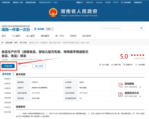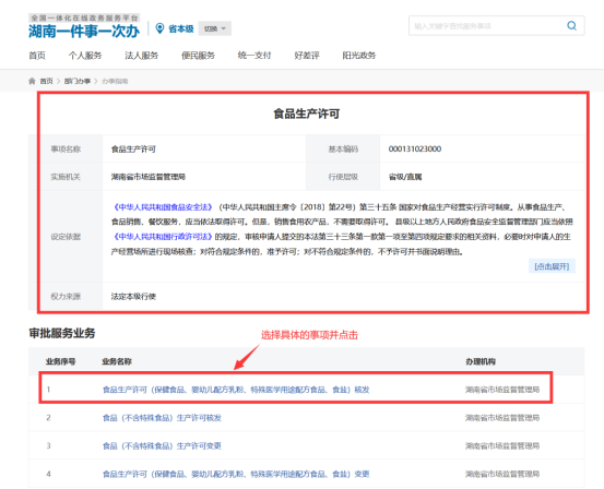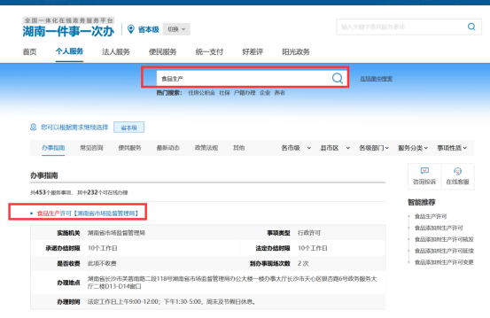 点击上图中的“食品生产许可【湖南省市场监督管理局】”,系统自动跳转到相应的“办事指南”页面(如下图)