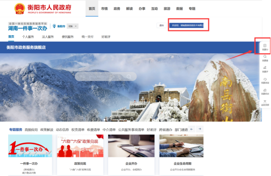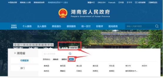 方式二:市级业务办理。以衡阳市食品(含保健食品)经营许可证新办为例 企业(机构)名称: 湖南路索信息技术有限公司 统一社会信用代码: 91430000MA7AD289XN 第一步:打开省政务服务平台(http://zwfw-new.hunan.gov.cn/),点击“登录”,然后选择“企业”中的“电子营业执照登录”,用手机微信或支持宝上的电子营业执照小程序的“扫一扫”功能扫一扫即可成功登录(详见省级登录方式)。 第二步:在省政务服务平台主页面选择下图所示的“切换”,然后选择“衡阳”,再点击“前往”,系统将切换到衡阳市政务服务平台。
