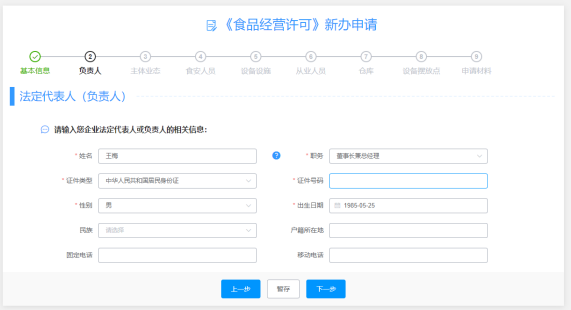 3、“负责人”信息标签页,补全负责人信息,单击【下一步】;