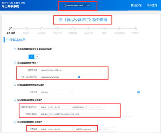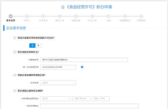第四步:选择“《食品经营许可证》新办”后面的“在线办理”,系统将自动打开省市场监管局的统一行政许可审批平台(食品经营许可)页面,选择“新办”后系统会把“申请主体”的相关信息(比如法定代表人、住所等)自动填充,申请人按系统提示填报相关的信息后提交即可。