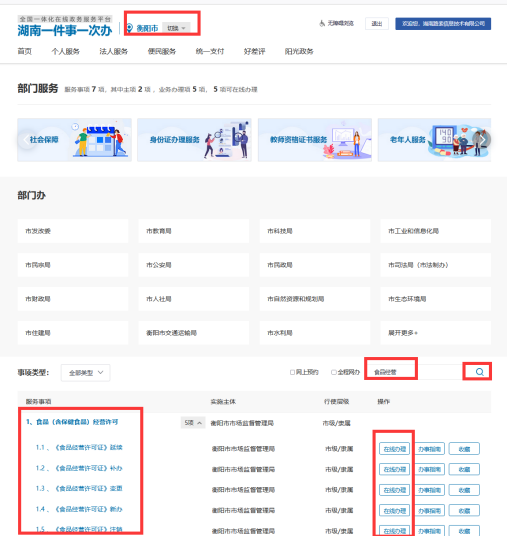 第三步:在衡阳市选择相应的事项并选择“在线办理”