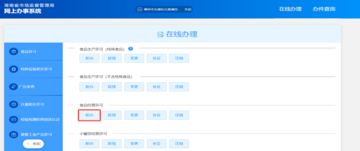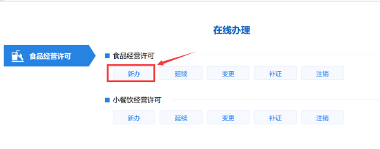 二、在线申请食品经营许可与食品小餐饮经营许可的操作基本相同,本手册以“食品经营许可”事项“新办”申请为例,介绍企业在线申请操作的全流程。 1、用户外网登录后,“食品经营许可”“新办”申请由“在线办理”页面的【新办】按钮发起。