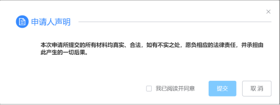 10、弹出“申请人声明”小窗口,勾选“我已阅读并同意”,单击【提交】提交外网申请;