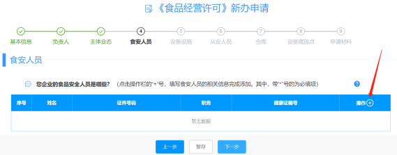 7、小窗口关闭后,单机【下一步】,“设施设备、从业人员、仓库、设备摆放点”同“食安人员”信息标签页;