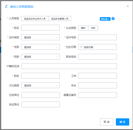 5、“食安人员、设施设备、从业人员、仓库、设备摆放点”这五个信息标签页的填写都是通过单击“操作”跳出编辑小窗口;