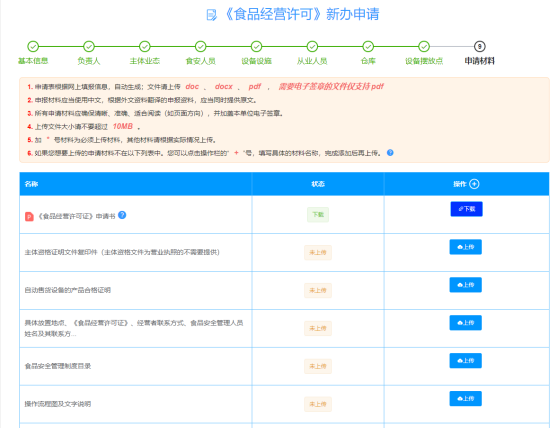 8、“申请材料”信息标签页,单击【上传】上传申请许可证所需的相关材料附件(上传附件格式为doc,docx,pdf),上传完成后单击【提交】;