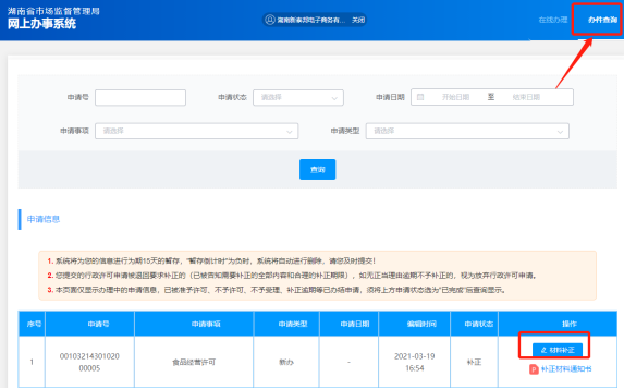 三、退回补正内网审批端对申请人提交的申请给出了处理结果为“退回补正”时,申请案会退回外网;申请人登录外网后单击【办件查询】找到相应申请,单击【材料补正】重新进入申请页面,根据内网审批端的处理意见修改申请内容;