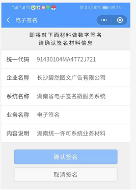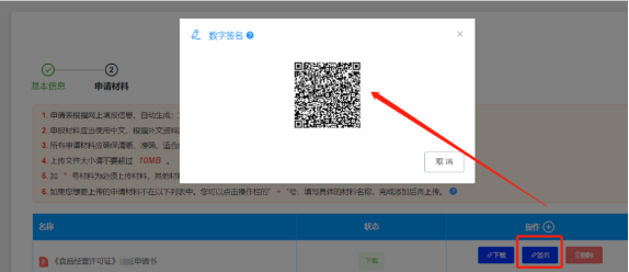 点击【签名】按钮,弹出二维码,使用电子营业执照扫一扫功能,扫二维码进行电子签名,签名后在“申请材料”信息标签页单击【提交签名】提交申请。